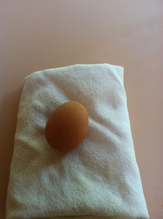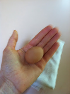 Here is the first egg of the farm. It was one (small) bite per Cawley.